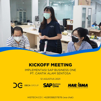 Kamis, 12 Agustus 2021 telah terlaksana Kickoff Meeting PT. Cantik Alam Sentosa (Whitelab) bersama Histech (Harrisma) dalam mengimplementasikan SAP Business One. Diharapkan kerjasama ini memberikan kemudahan dan meningkatkan kualitas proses bisnis PT. Cantik Alam Sentosa dalam meraih pencapaiannya.